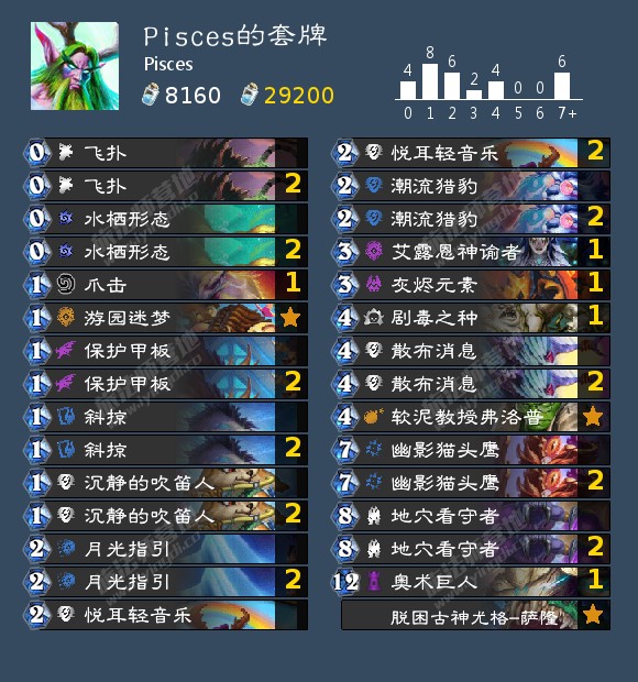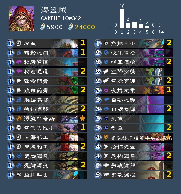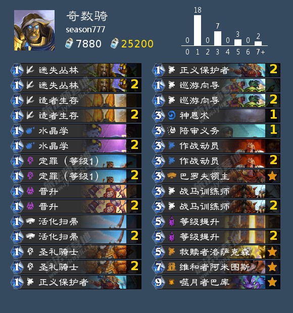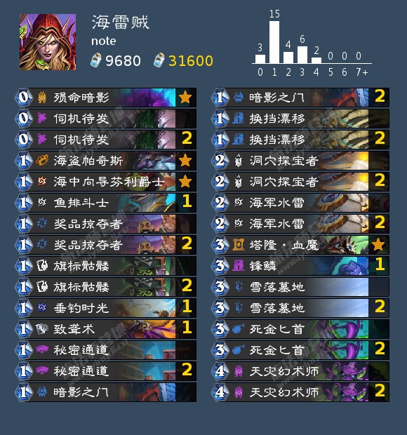 - 天梯卡组: 三窟德,口德,花蕾机克德,血誓口德,野兽猎,奥术开门法,泰坦奇数骑,海雷贼,海盗贼,巨怪任务术