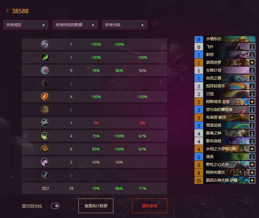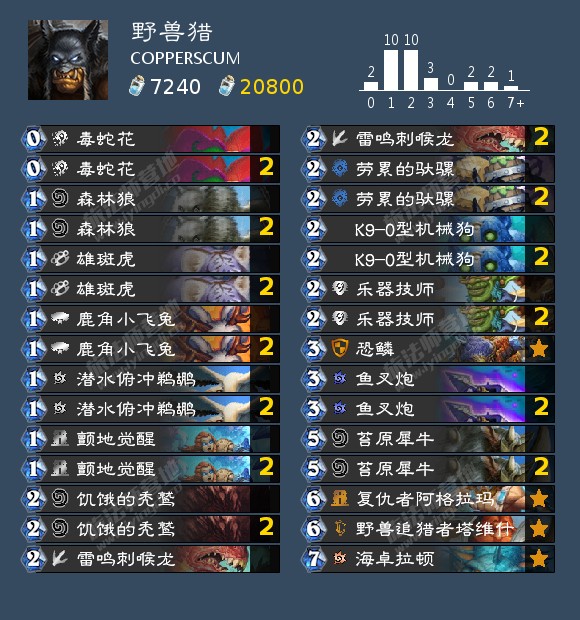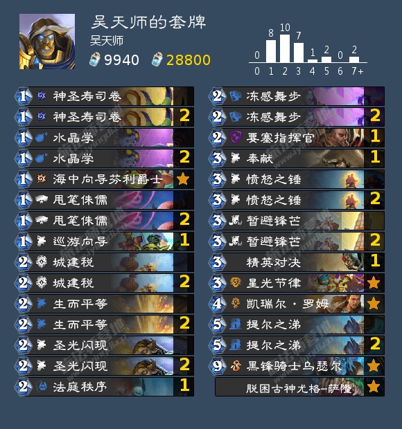 美服,ID:hbeiwtcppp#2865,两天黄金到传说,60余场,胜率80%(由于没有携带插件,无法直观看到胜率,但可以参照下图段位和时间变化),对阵天梯主流德牧贼皆有赢点。卡组整体构筑由解场+滤牌+dk+提尔之涕的组合,职业生物仅带一张罗姆,用于润滑费用或减费提尔之涕,达到更好的斩杀。(切记,提尔之涕只能复活4个生物,如果不是快攻对局,千万不要摇报高兵,污染复活)由于携带了大量的法术,这套满编的甩笔侏儒,在前期的场面处理上有极好的发挥,远远超出我的预期,这也是我较为满意的地方。斩杀方式多种多样,当你死亡过2个不同的天启后,可以选择使用提尔之涕复活2个天启,摇出第三个天启,在第二张提尔之涕复活3天启+技能完成斩杀。如果提尔之涕被罗姆减过费用,当你死亡过2个不同的天启时,可以提尔之涕+要塞指挥官摇两次技能完成斩杀,刚好十费如果死亡过罗姆,仅死亡过一个天启,当手里有两张提尔之涕和要塞指挥官时,也可以先打出一张提尔之涕,召唤第二个天启,并为手中的提尔之涕减费,下个回合打出提尔之涕+要塞指挥官摇两次技能完成斩杀也可先使用要塞指挥官摇两个天启,后面两个回合各打出一张提尔之涕,完成3天启和4天启