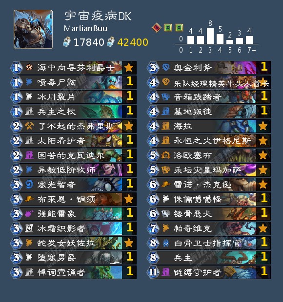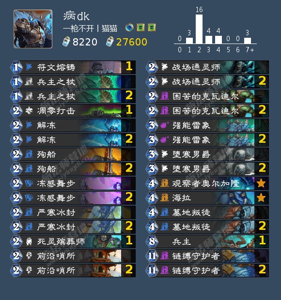 我在神棍直播间学的病DK,70%胜率打进亚服前三百。实测打贼德等奇迹卡组和众多宇宙卡组均优势,打偶萨奥秘法小劣