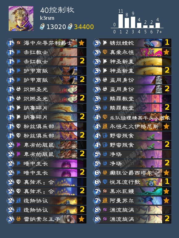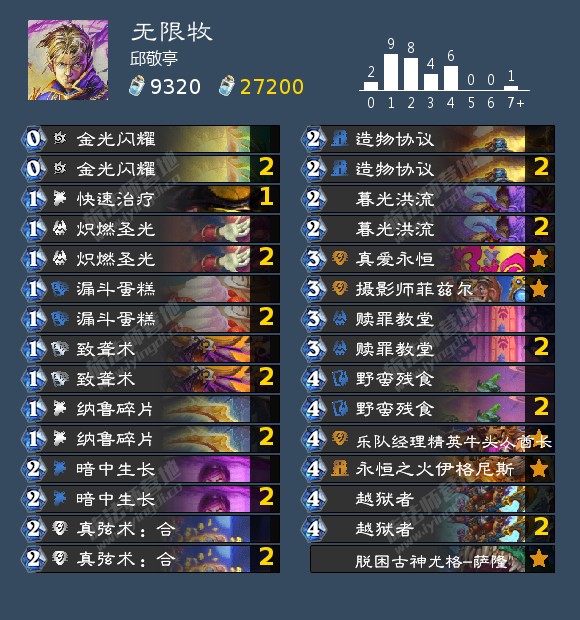 从导演贼、8月的一套30控制牧那里得到灵感,我们牧师也有自己的回手和复制( ﹡ˆoˆ﹡ )。起手不留赤红教士以外的随从,控制住场面,打快攻就速刷导演解光,其他就刷菲尔兹(照相别照进真爱永恒)打的场数不多,后续可能再修改构筑,目前看来强度还是不错的(但是耗脑子)几个可能的修改思路:1 去掉赤红教士和俱乐部,换3费奶8+流行歌或盗用身份2 加入牛牛,塞脏鼠换手手蛇软等(女武神就算了)3 直接加脏鼠4 解牌带哪些可以再打磨一下5 阿曼苏尔能不能删(没开玩笑,相对导演,阿曼苏尔太笨重了)新人投稿,自组卡组真的超有趣,上个月美服另一套自组卡组上传说。