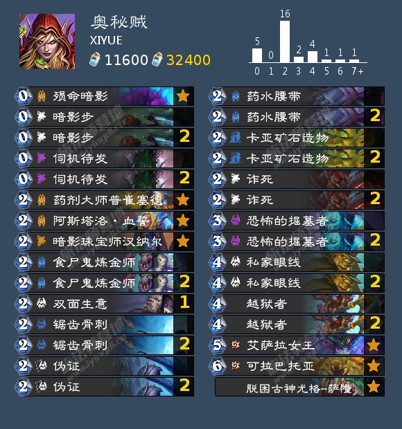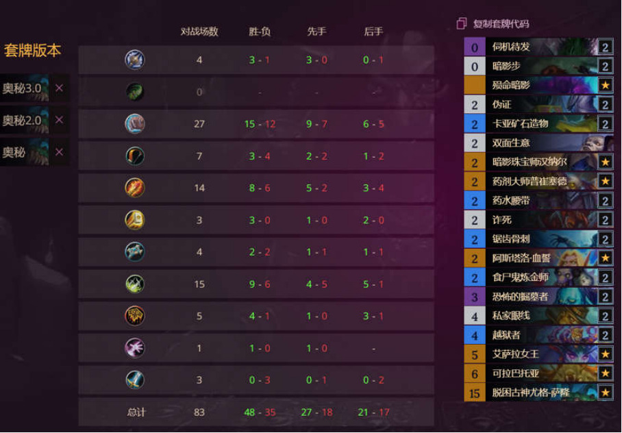 这一套牌中我没有携带优质单卡越狱者,主要原因就是承担前期节奏的奥秘体系本质上是随从为主,并不能保证越狱者的按时亮相,所以不如不带。其他则都是奇迹贼的底子。