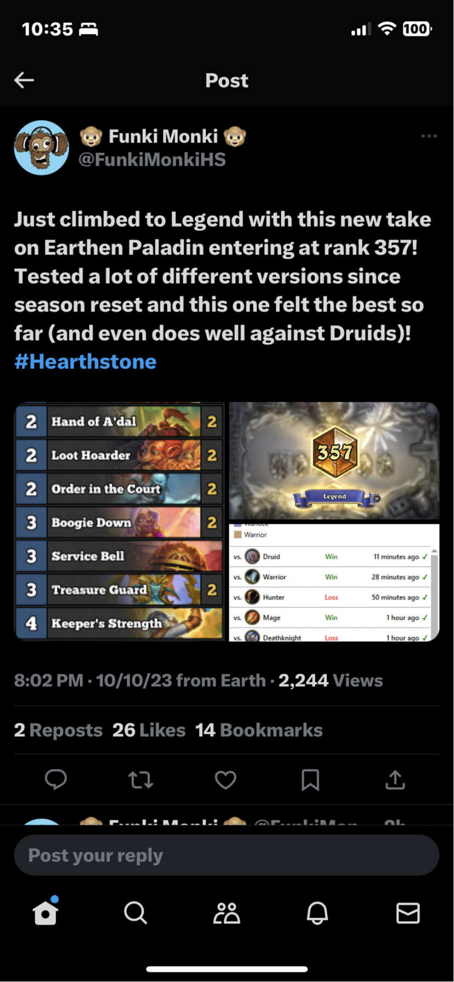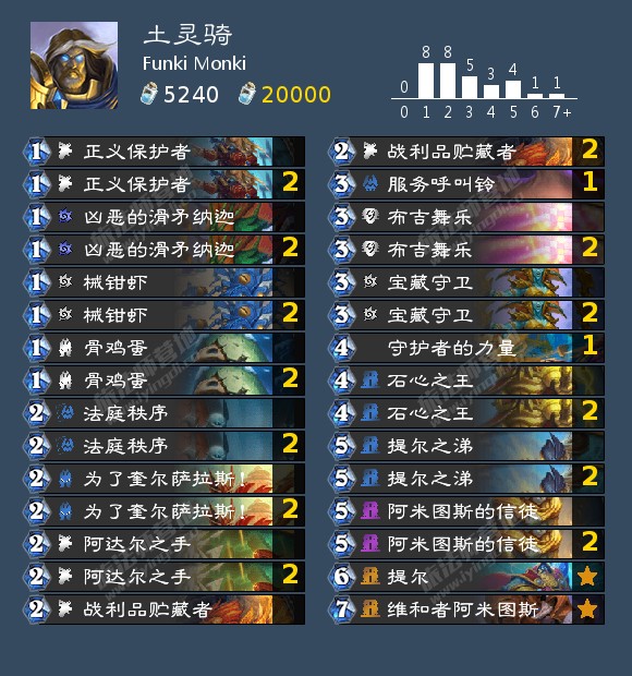 Funki Monki是美服娱乐向主播,经常分享有一定实力的新颖非主流卡组。作者这套土灵骑低费曲线拉满,带了很多1费赖场随从用来配合2费buff和3费布吉舞乐,尝试用前期对抗环境霸主跳费德。由于前期赖场能力强,排序后稳定抽泰坦可以buff场面,然后跟上提尔和复活,思路很有趣。