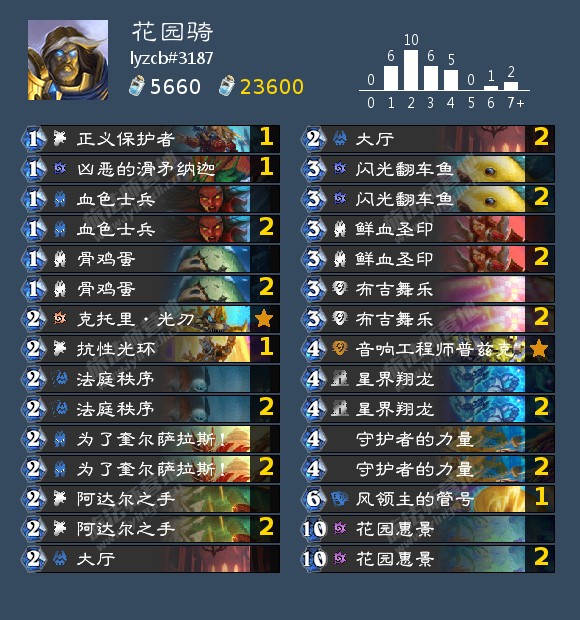 花园骑在音乐节上线后迎来的多张组件标志着这套卡组的成型,而因为一开始的环境里面控制牧/术太多难以招架,现在在德大行其道的情况下,这套骑士也有了登场与冲分的机会,抗性光环可以有效遏制德鲁伊在单回合的操作上限,守护者的力量也能打铺场内战或者返场,整体造价也比较便宜,上手难度比较低,很适合新手拿来上分。德多的环境就去掉一张打铺场内战的翻车鱼,满编抗性光环,没有光刃也不需要专门合,这张牌抓德用的,用来提供额外的buff资源,打很多卡组站不住,可以换一张十字军光环,强度不会有太大影响