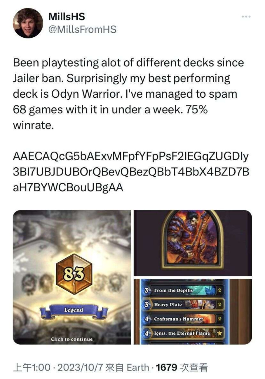 自从典狱长被ban了后,我一直在玩别的不同的卡组。令我惊讶的是奥丁站竟然是最出色的,我一周内打了68局,75%胜率,如果对面2费或者3费没有自然之拥或者只要不是跳费锻刀德 随便赢,