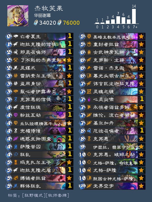 给对手一点点娱乐震撼!开局两个王子亮相,化身暗影,克苏恩裂成碎片,开始一场奇妙的畸变,时光龙登场。游戏中克苏恩和迦拉克隆时不时从左边亮起,三个尤格萨隆时不时上场放电影。这套卡组没有任何赢点,完全为了杰牧笑果,大火谨慎合卡。