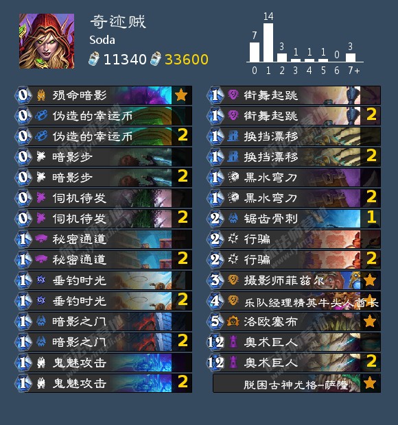 奇迹贼带拍照已经是主流选择,拍照暗影步就可以达成无限,因为现在基本人手一个尤格萨隆泰坦,铺+塞布已经不能稳定制胜。为什么不带大范是很多人问的问题,个人认为这张卡比较吃配合,我会更愿意留法力去过牌刷法术,刷出0费巨人也能达成差不多的效果。