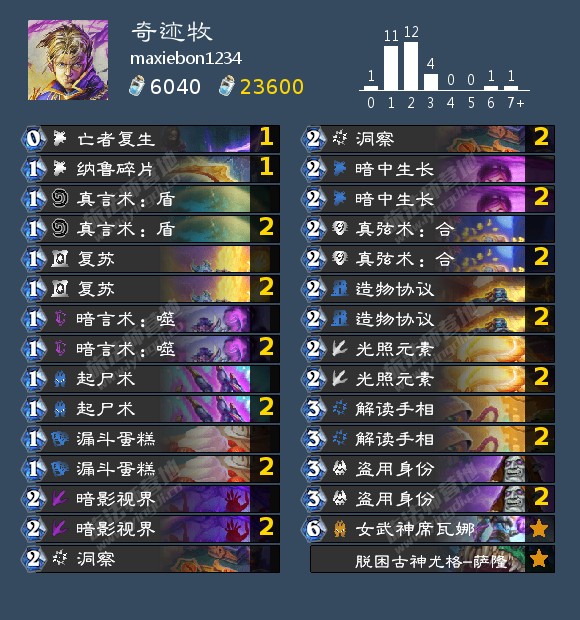 奇迹贼、血誓口德都是能稳定上分的选项;门在美服环境不是很好,很多暗牧和带私法程序的德;带9+3的任务术可以4费启动杀人,上限极高;任务瞎带上塞布和音响好像挺不错的,可以打(不胡的)奇迹贼和各种德。