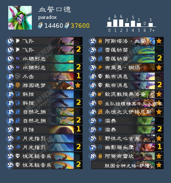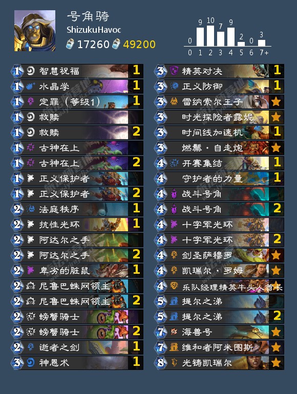 - 天梯卡组: 40爆牌德,血誓口德,宇宙猎,开门法,号角骑,宇宙暗牧,拍照奇迹贼,弑君贼,塔迪乌斯任务术,激怒战