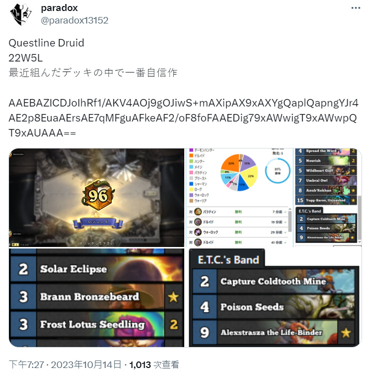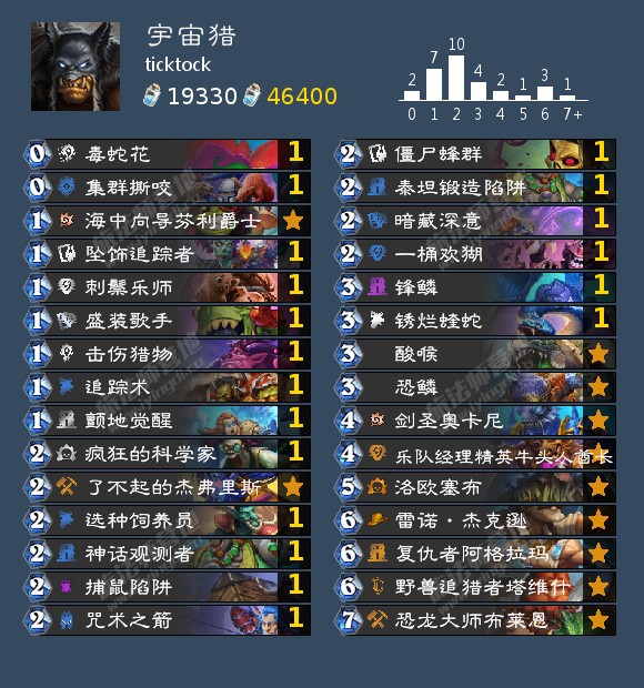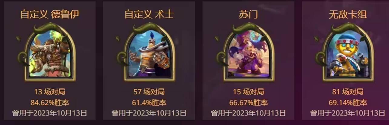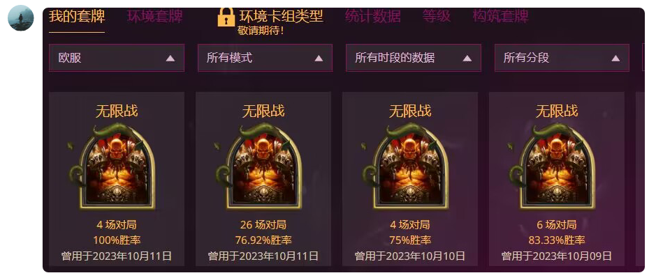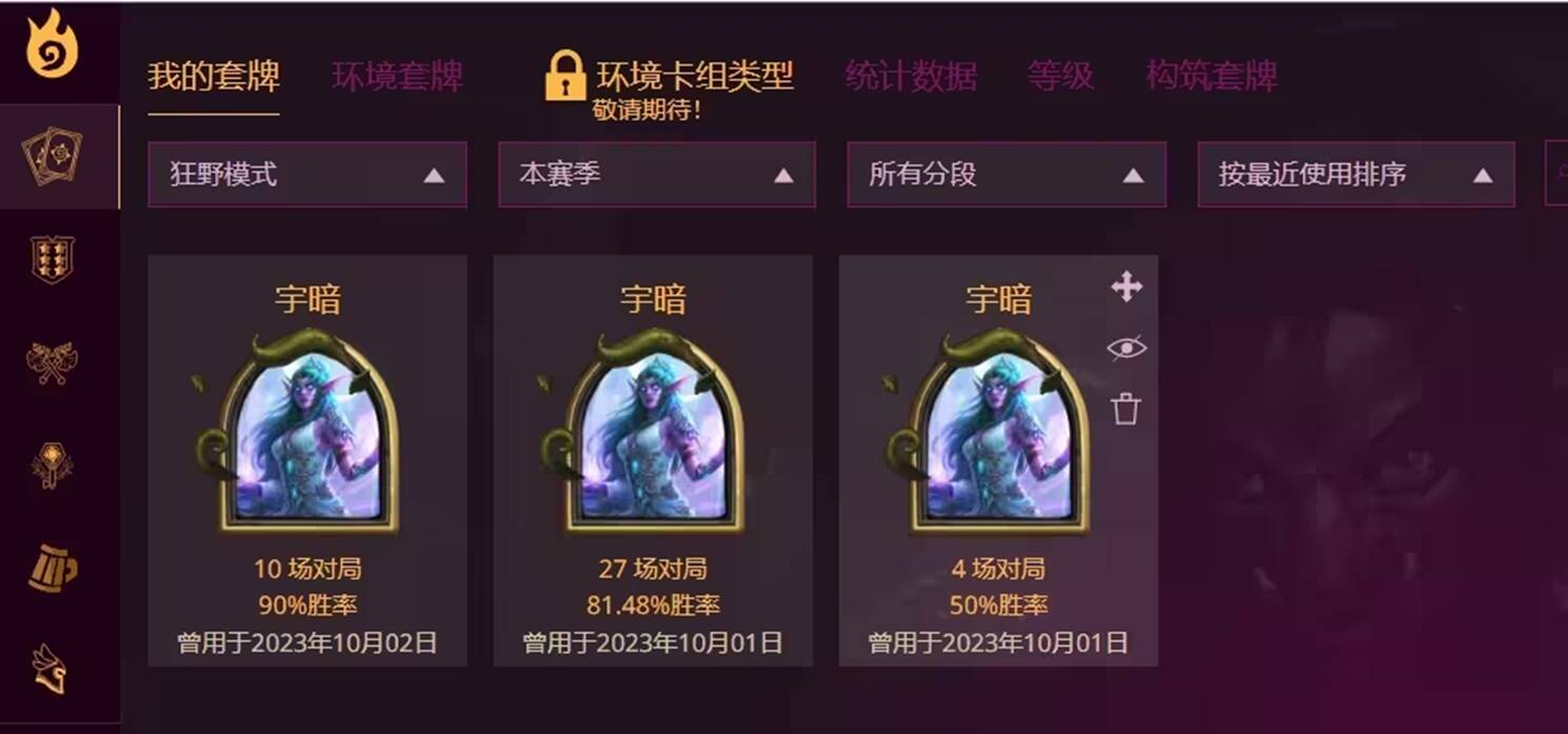 其实也不算是全新,因为号是九月末开的,但狂野也就打到黄金,所以也可以算开荒! 事实证明,最近的环境真的对宇宙猎很友好,能让我新号直接上前百。(日报宇宙猎的投稿数也可以看出来) 本来因为都是用手机玩的还以为没有胜率了,还好听朋友说火石个人数据会记录所有对局,正好这号也就玩了一个月,所以就拿火石数据勉强当胜率了,实际应该也差不了多少。 不过还是要说一句,宇宙猎的入门门槛较低,但是要熟练难度还是比较高的。而且狂野环境变化快,一旦宇宙牧等慢速卡组成为主流,宇宙猎将非常尴尬,没理解很难上分,所以要合的小伙伴还是要慎重~
