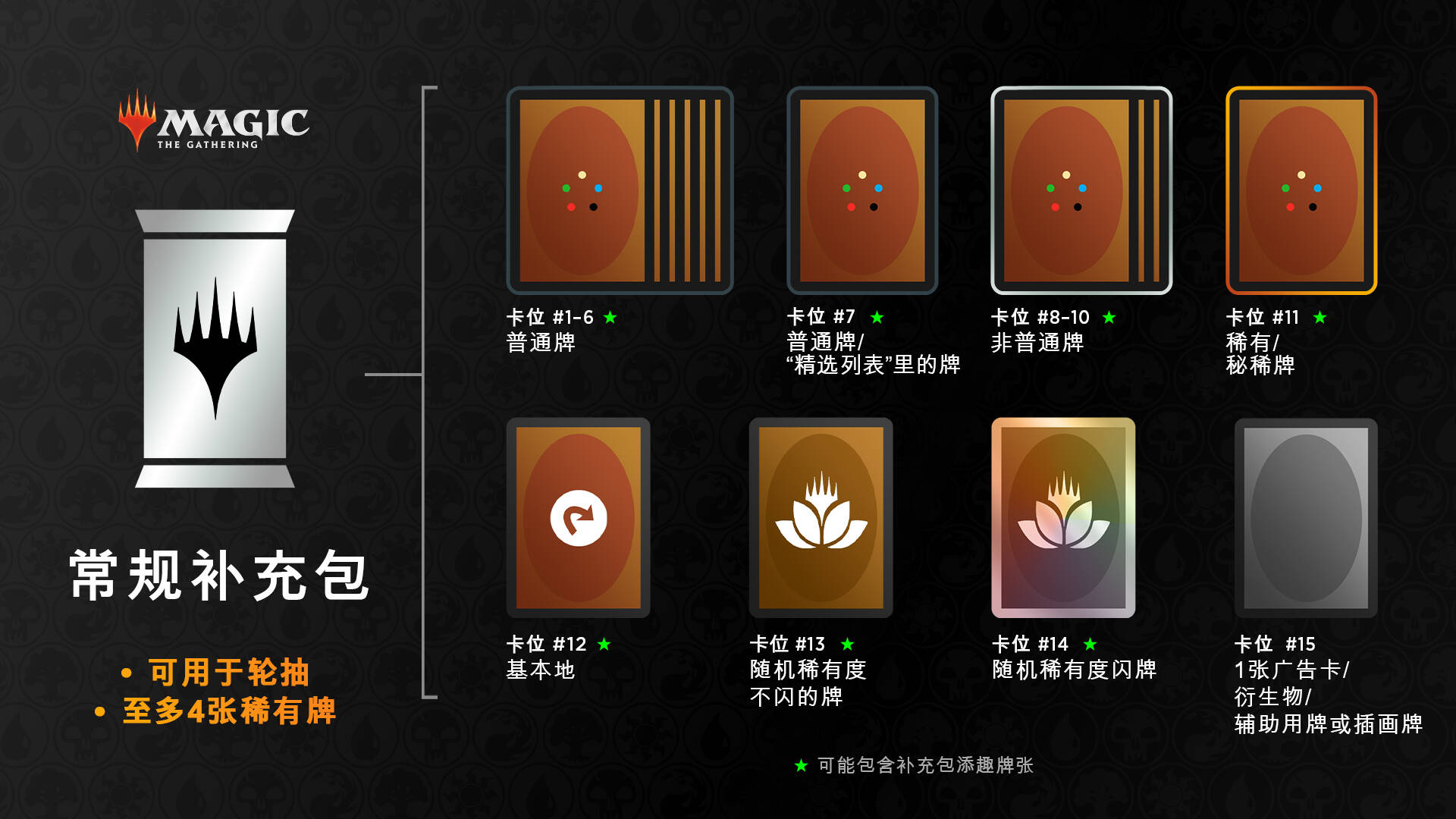 这些专门留给非普通牌的卡位和在系列补充包里的一样。这些牌都是主系列里的非普通牌。其他卡位也有可能开出非普通牌,但是这三个卡位始终是非普通牌。请注意,这些牌和普通牌一样,不像以前系列补充包那样彼此有联系。和普通牌一样,这个卡位里也有机会获得补充包添趣版的牌张。