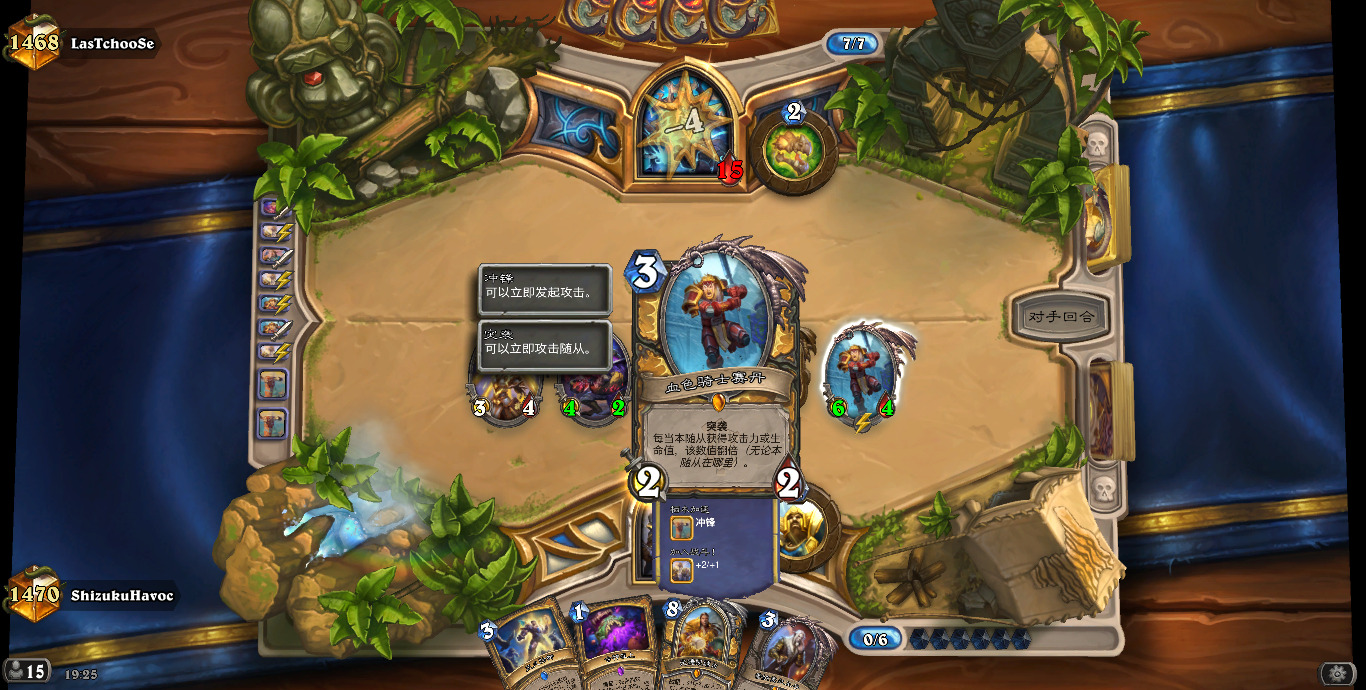 (下面有张图是我阻止对手口死我后顶了铜须机关枪又顶完铁锭古夫大吸血刀后险胜的画面)