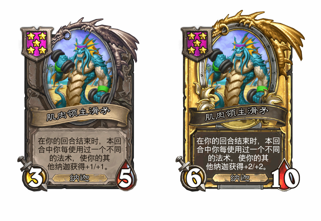 - 5星3/5纳迦,在你的回合结束时,本回合中你每使用过一个不同的法术,使你的其他纳迦获得+1/+1