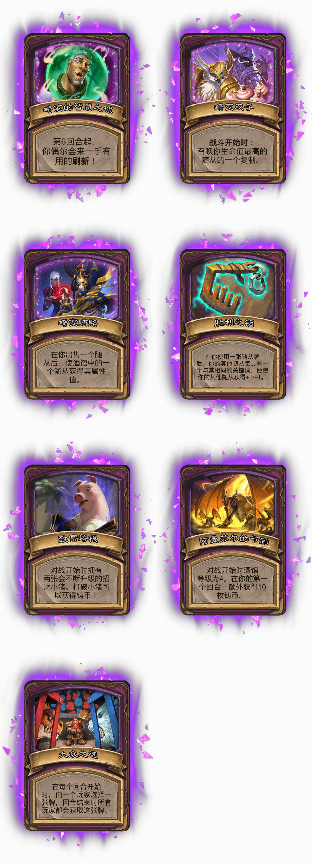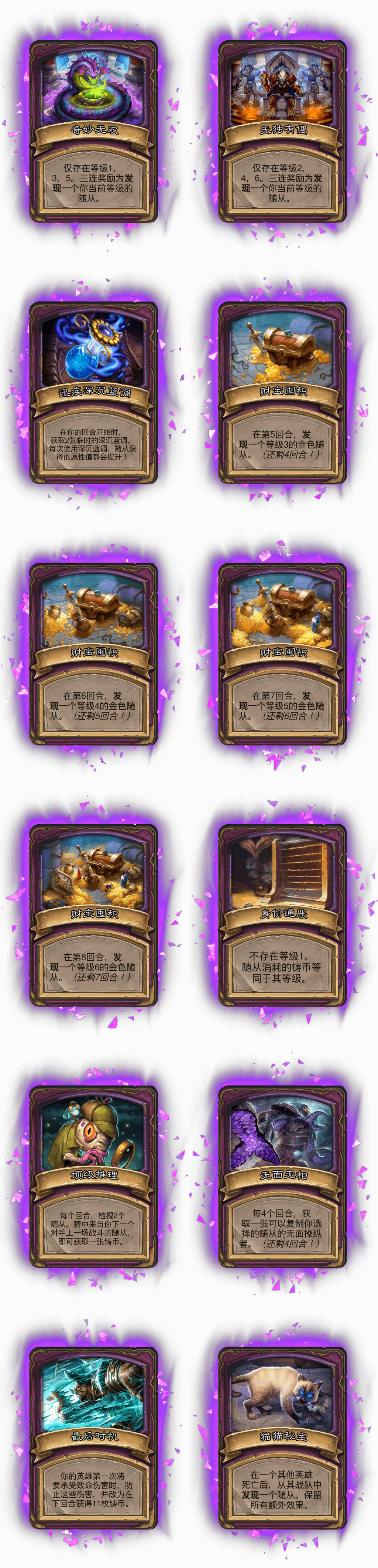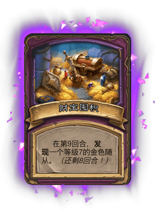 *财宝囤积拥有多个版本,参考全是××——而且通过拆包可知,财宝囤积其实还存在9回合发现7级随从的版本,但没有写在补丁日志里。这可能像共犯/全是反派一样又是一个较难触发的彩蛋。
