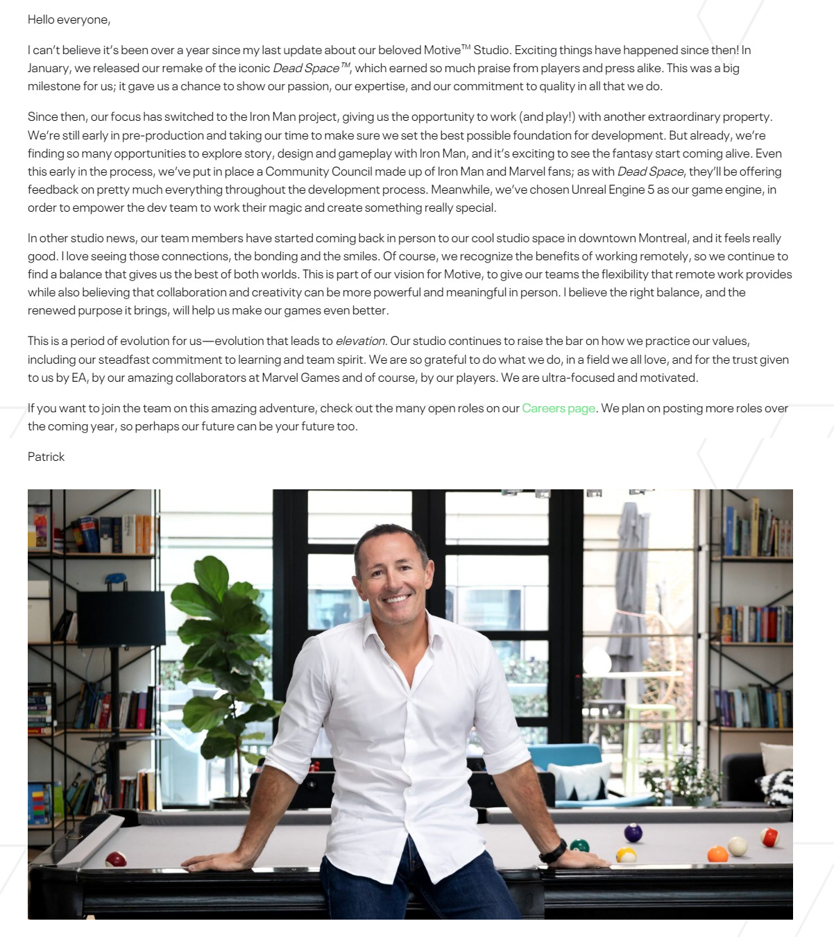 在发售《死亡空间:重制版》后,开发商EA Motive Studio转向了基于漫威钢铁侠的新游戏,现在Motive的总经理Patrick Klaus发文重点介绍了他们的新项目。