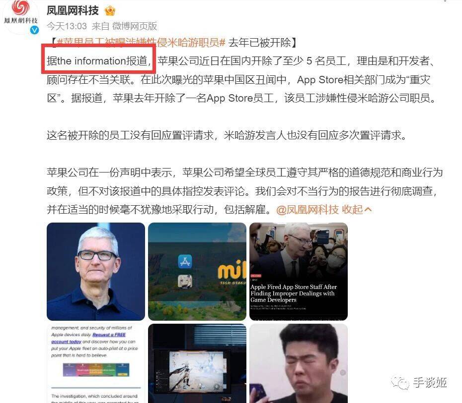 也就是说,这件事的唯一来源是the information的报道,该报道还是采用的专栏记者模式,该记者表示事件是由“知情人士”透露的,文章唯一采用的图片是前段时间库克来华时的照片,文章内部并没有有关此事的相关引用。