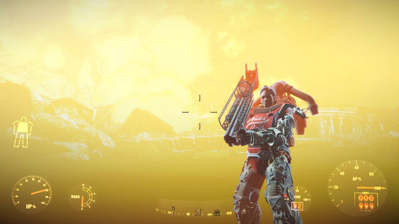 我认为游戏中波澜壮阔的一场战斗,就像是当年辐射3的时候大家跟着大机器人Liberty一路战斗的感觉。这次是在一架坠毁了200多年的巨型飞机当中敌我双方全是动力盔甲,敌人身手敏捷,伤害奇高。要不是我带足了小胖子是不可能拿下这场战斗的。最后胜利的我动力盔甲四肢皆毁,头盔也被炸得粉碎,但是在一片核爆当中我留下了自己最帅气的一张截图。摄于未知之地。
