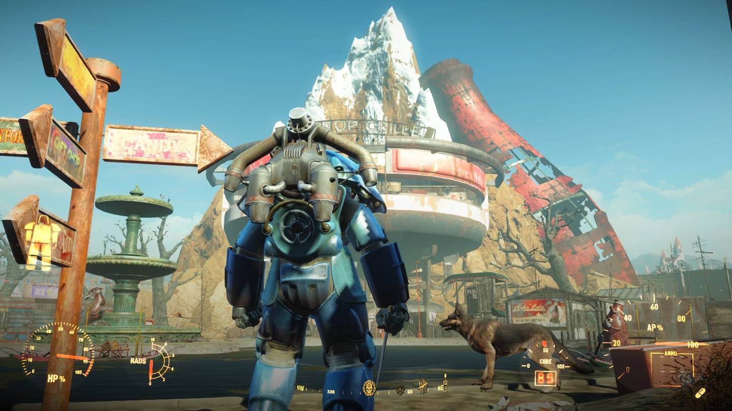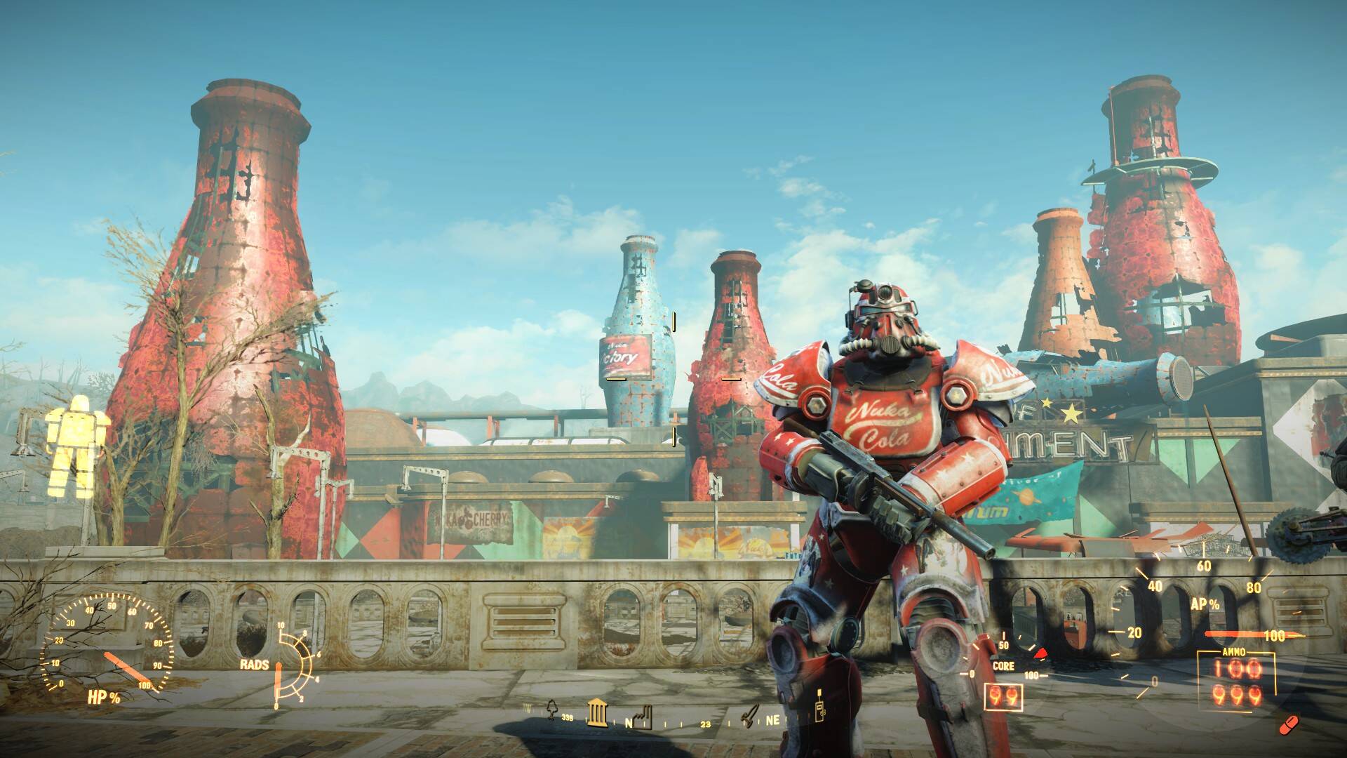 山脉:这里我真的好激动,Nuka World(核子可乐世界)是辐射4的一个DLC,里面类似于一个生产制造核子可乐的工厂+一个核子可乐主题的乐园。当然,欢乐之下充满了危险。在这里有壮观的可乐山,在这里你还能获得传说中的“金色传说”装备——天蓝色X01英克雷动力盔甲,对,就是我身上这件。手里的大宝剑是一把中国古代的将军剑,英气逼人。