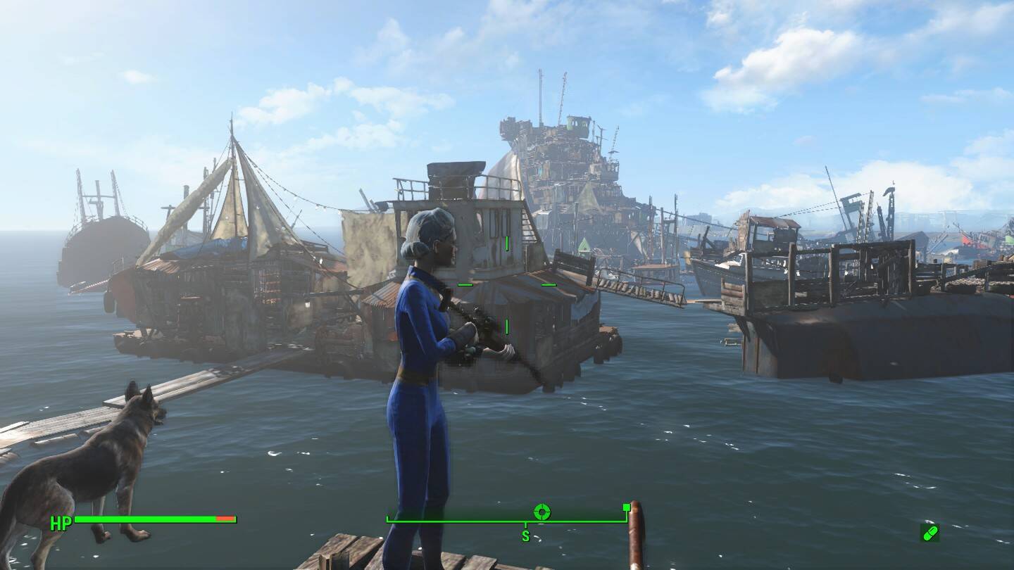 海岛: 是的,主角找到了狗肉!从《辐射1》开始便伴随玩家的最忠心的小伙伴!并且主角的装备也升级,背后背着一把猎枪。而她面对的是一个叫做Libertalia的地方(自由意大利?),这是一个用各种废弃船只组织起来的小王国。可以看出来插画的还原度非常高。