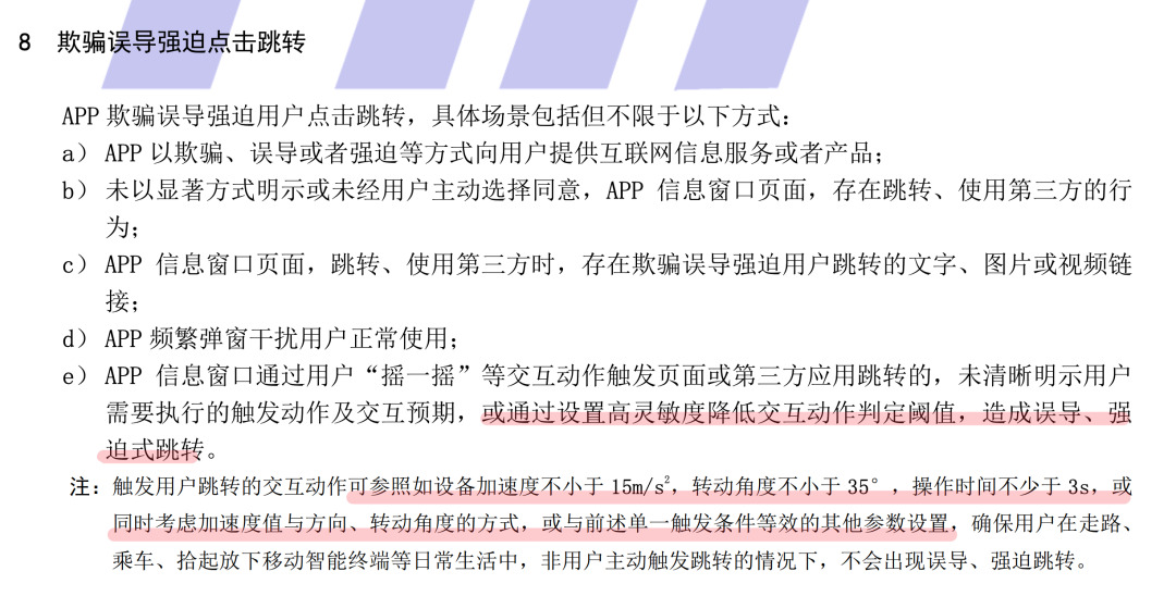 去年 12 月,电信终端产业协会就给摇一摇广告定了个规范,要求触发灵敏度不可过高,比如设备加速度不小于 15m/s²,转动角度不小于 35°,操作时间不少于 3s 等等。