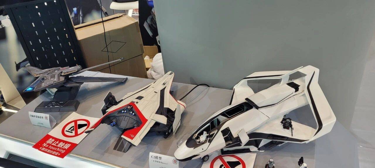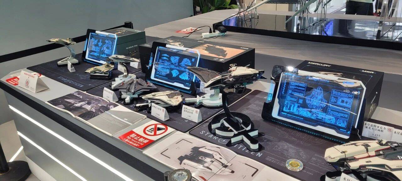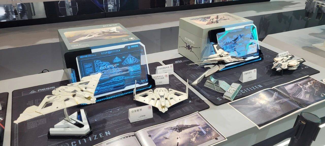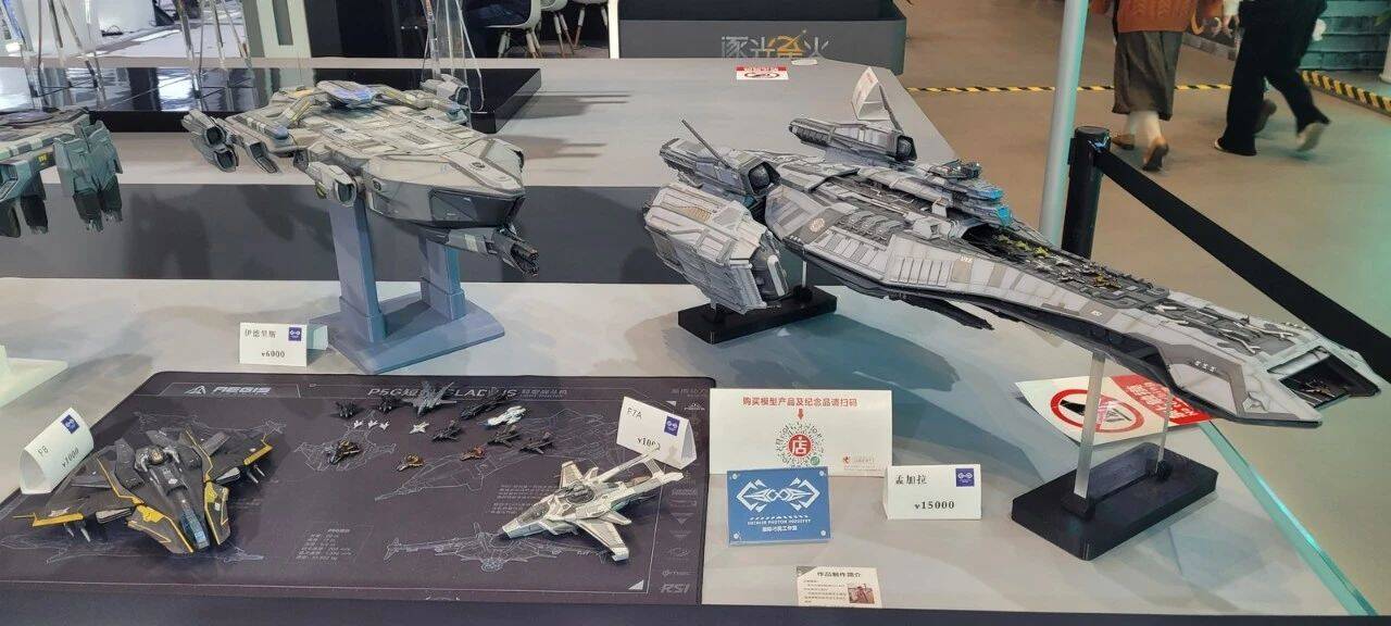 在标枪边上,陈列着一众来自星际公民游戏里飞船的模型,都是等比例还原出游戏里的样貌。