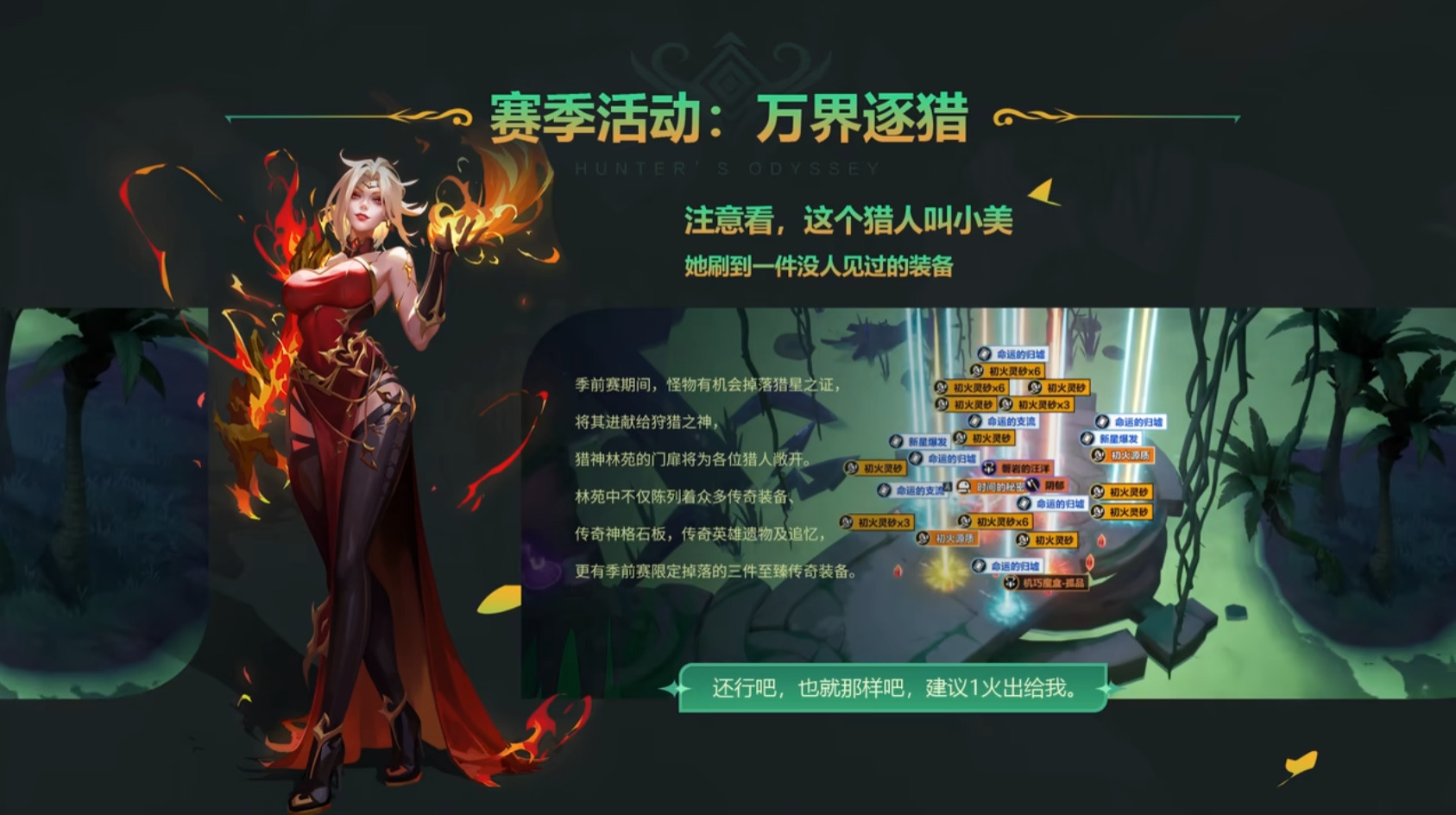 除了新玩法,赛季活动”万界逐猎“也将同步开启。在季前赛期间,所有关卡中的怪物都有几率掉落全新的特殊掉落物——猎星之证。收集它们进献给狩猎之神,就能够开启猎神林苑,通过开启宝箱的形式自由获取众多传奇装备、传奇神格石板,传奇英雄遗物及追忆,还有三件季前赛限定掉落的至臻传奇装备。被冠以”孤品“的三件传奇装备,它们将获得更宽松的效果触发条件、更高的额外加成与更契合新赛季玩法的效果。