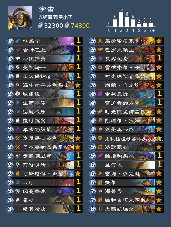 我带了光明使者之锤和灰烬元素,都是有效的针对卡。锤子可以单杀海盗贼的223船载火炮和偶数萨的203驻锚图腾,非常好用。灰烬是克制开门的,被打的恶心吐了。其余卡位都是常规卡位。打控制卡组的话一定要注意随从的交换,确保自己的先手和主动。圣礼骑士定向过定罪,配合光注剑龙(找风怒或加攻)为一回合内的超高爆发做准备。