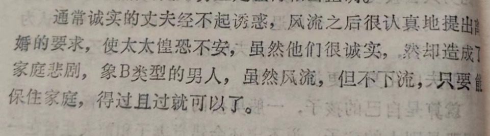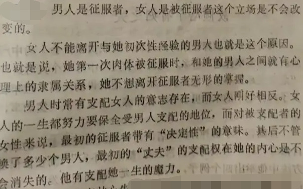 虽然我们不能忽视时代背景来评价书的内容,毕竟当代剑斩前朝官也没有意义,但还是能显然看出本书作者极强的男性至上意识,和喷涌而出的物化女性的态度。获得了女性“第一次”的男人,就拥有支配她一生的魔力,这样的发言别说放在今天,就连放在二十年前可能也得吓死人。也许对当时的中国读者来说,阅读这般将女性放荡式解构的书籍,就和如今的我们读男频爽文感受到的快乐差不多吧。虽然这是将近四十年前的书了。