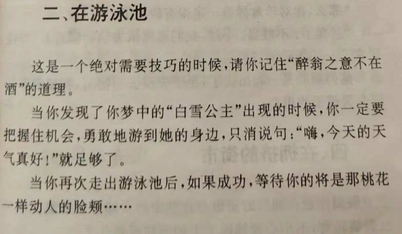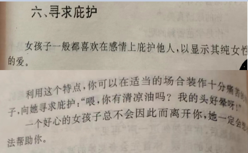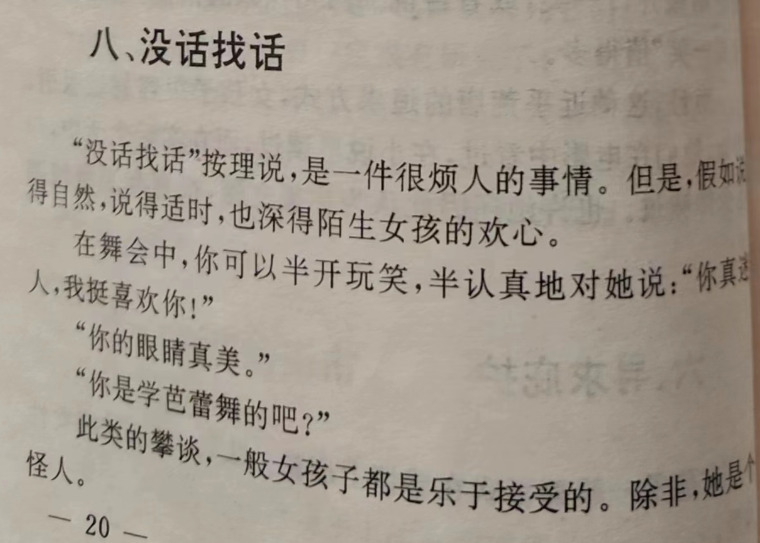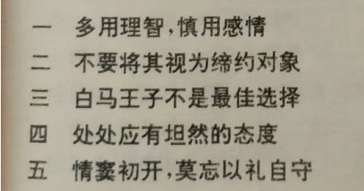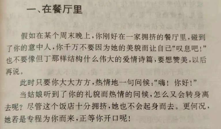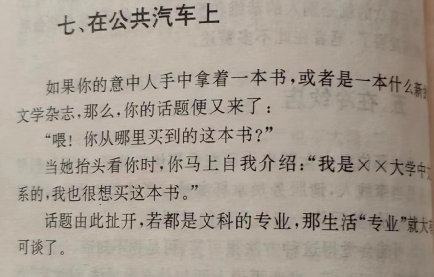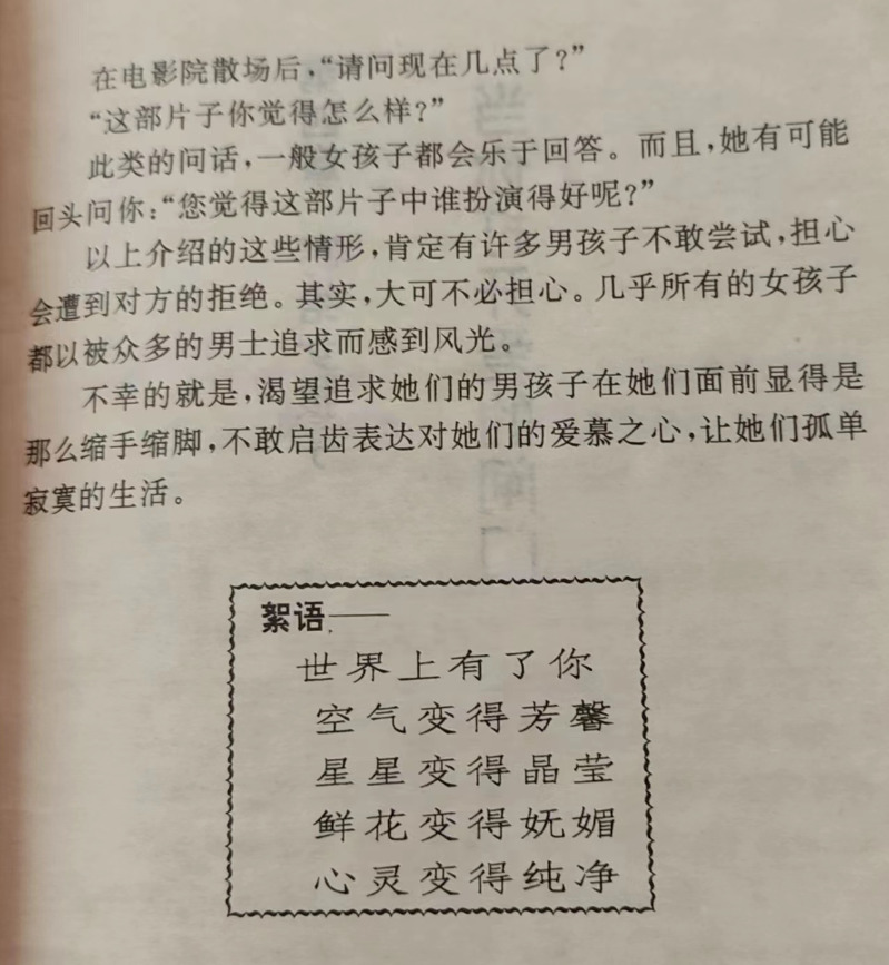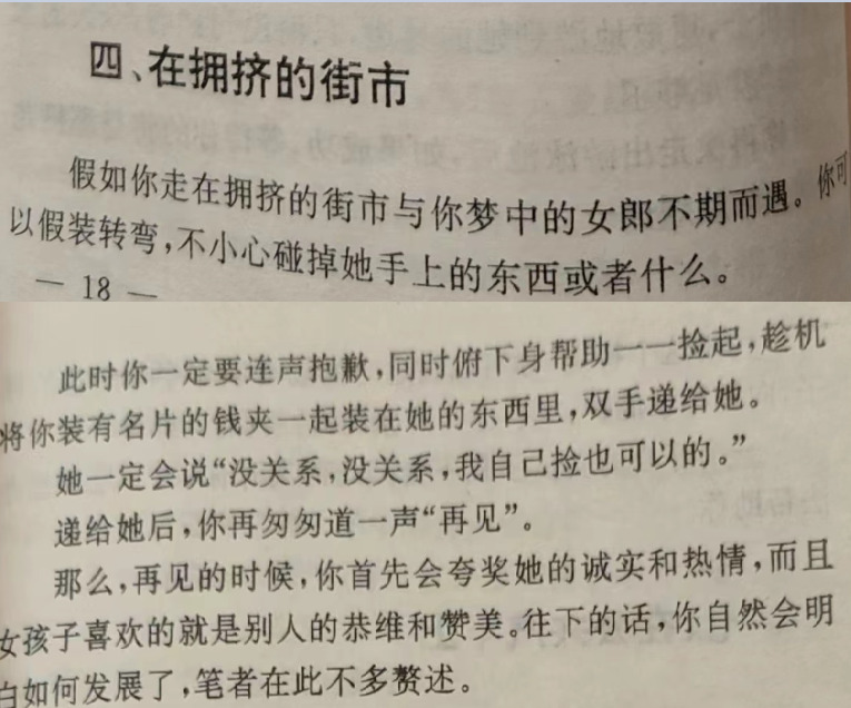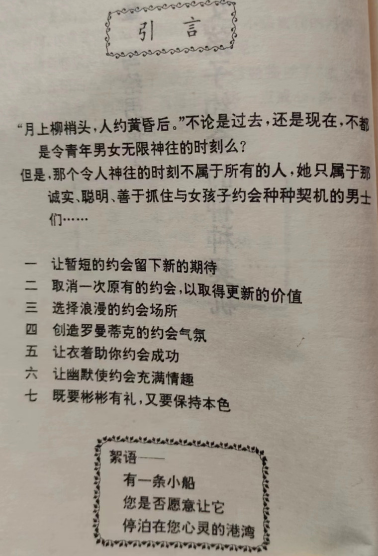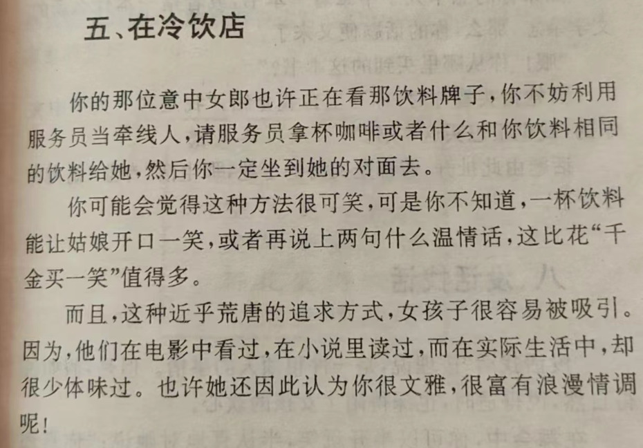尽管我们同样能在这些质朴的文字中感受到不少浓厚的年代感和浅薄的刻板印象,但你能够看到的是,作者试图描述数种男性女性处于平等地位下绞尽脑汁创造沟通机会的场景,尽管不少套路非常“俗套”,但在1993年,这一切显得自然又可爱,而且在创造沟通条件的行事根本逻辑上,已经和现代社会所提倡的“自然恋爱”相差不远了。可以说,在当时这书可能是真的实用。