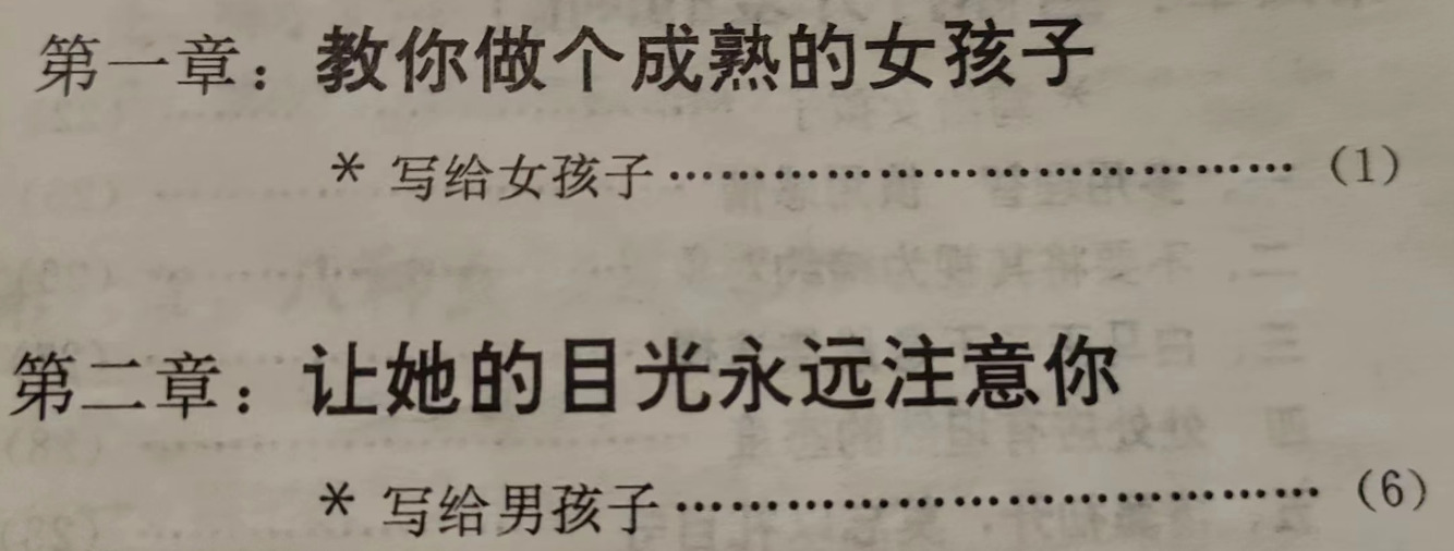 首先看看这本名字叫《摸透女人心 摸透男人心》的老书。当然,这标题不是在预设读者的取向是个双。近四十年前的情况,和如今万事万物必须严格分为“男性向”和“女性向”的产品风气不一样,从封面你就能看出来,这两本书主打的就是一个性价比+实用性——无论男生女生都能看。因为两本书还真就都专门为男女读者分成了不同的章节: