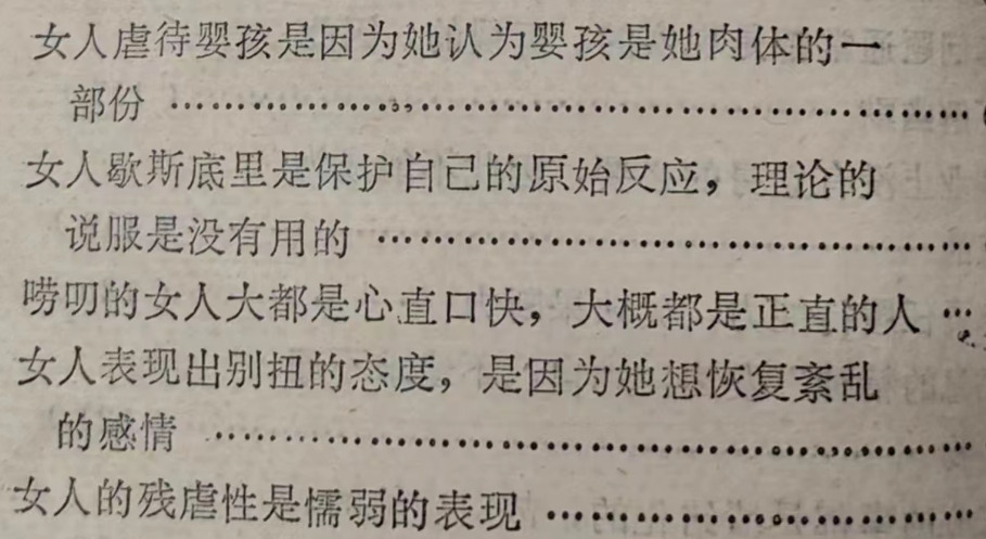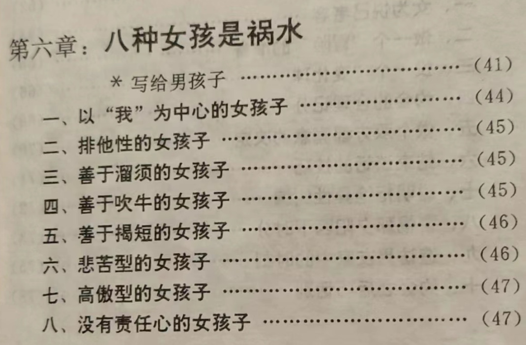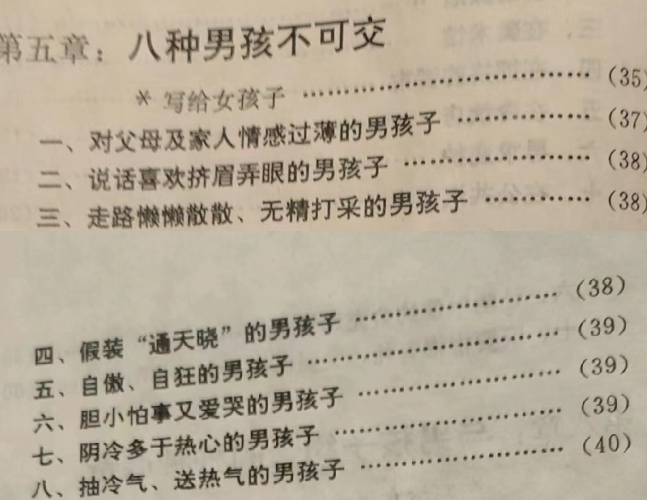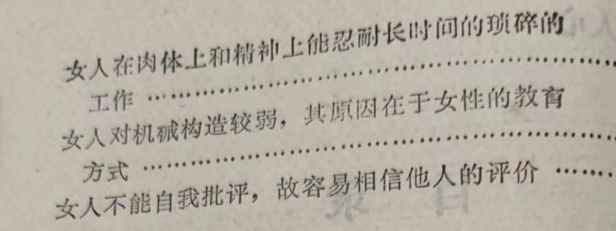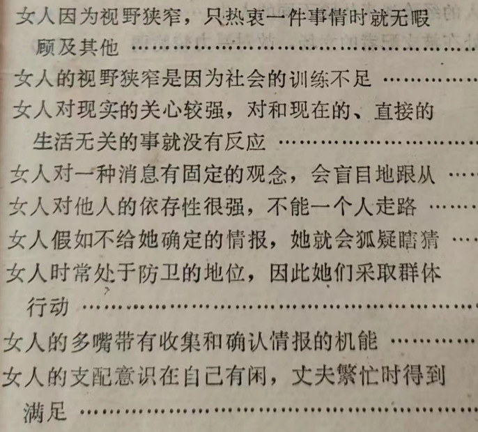 这本出版于1988年的老书,内容确实充满了年代感。里面充斥着那些我们已经在互联网上看过了几百遍的、对性别刻板印象的重复,爆典发言连当代孙吧老哥看了都得惊呼先人才是高手。