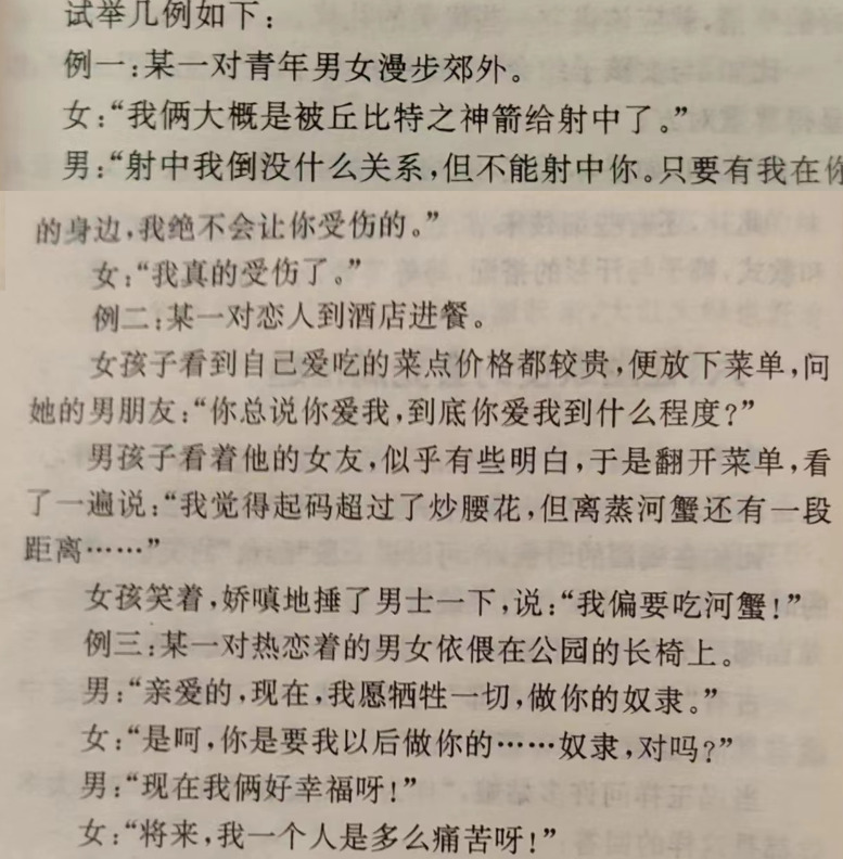 在利用对话增添情趣的部分,书里还举了几个让人有点绷不住的案例: