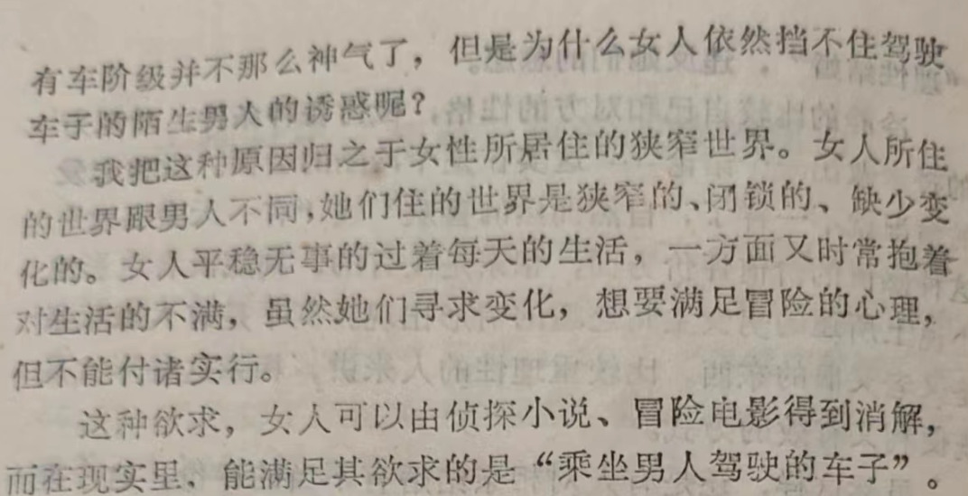 比如,如今我们2023年都还能在各种影视作品里看到这样的桥段:女生嫌弃男主车破烂,最后被大款的宝马给牛走了。而这种“女**豪车”的意象,连续半个世纪都在文娱作品中被当做展现女性角色“拜金”一面的典型场景。对于“女性容易被好车吸引”这件事,这本书是这么看待的: