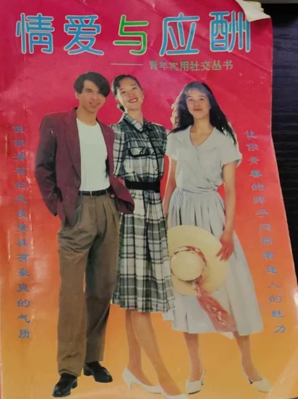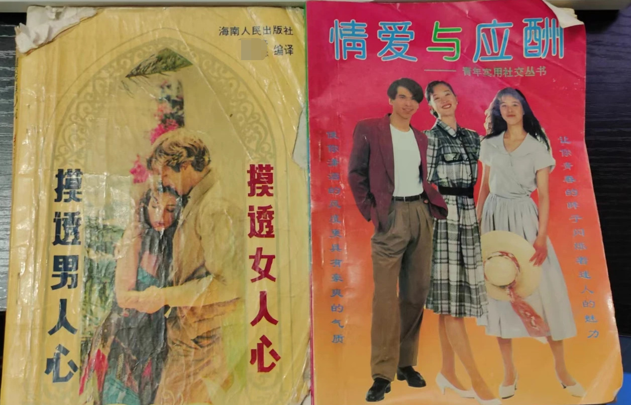 左边黄色封面的叫《摸透男人心 摸透女人心》,右边红色封面的叫《情爱与应酬 ——青年实用社交丛书》,左右还带了两句引言:使你潇洒的风度更具有豪爽的气质;让你青春的眸子闪烁着迷人的魅力。显然,这是两本情感类指南书,专门教那些迟迟找不到另一半的青年如何脱单。