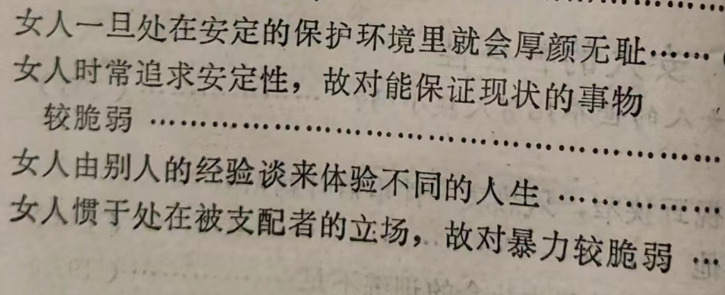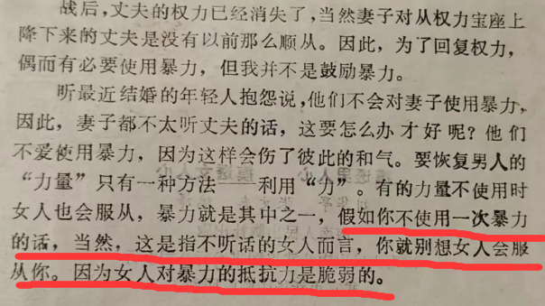 这段支持“暴力”是让女人服从的一种方式的阐述,显然非常带有曾经日本男女社会地位情况的色彩。尽管这书肯定也不是什么正经书,但至少在如今,这些句子是不太可能明面出现在中国任何一种正规出版物里的。