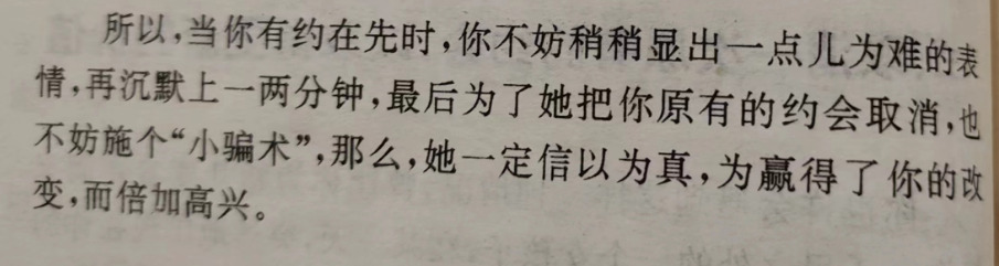 看这本书之前,我一开始想的是,哈哈,一本1993年的老书怎么可能可以助我找到另一半,哈哈这些老掉牙的陈旧搭讪方式,哈哈多么思维固化的男女性别刻板印象——