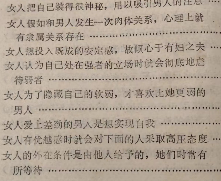 比如在“摸透女人心”的部分,书就根据情感、人际关系、教育等等方面,以“规律”的形式,阐述了本书所认为的女性的“特征”。