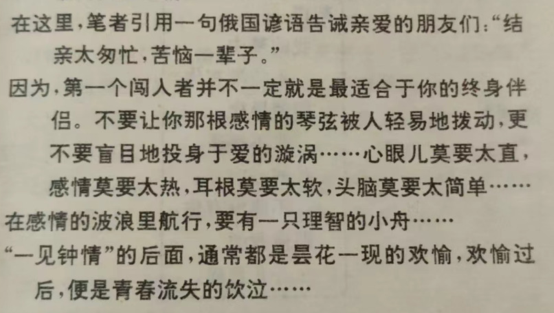一开始书就明确教导女性,不要盲目投身爱情,不要轻易动了真情,脑袋不要太简单,恋爱要理智,不要相信什么“一见钟情”。
