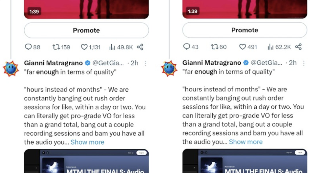 虽然他们认为使用 AI 配音可以提高生产力,但 Gianni Matragrano 却不太赞同,因为他的帖子被限流了,留言、转发、点赞直接来了个对半砍。