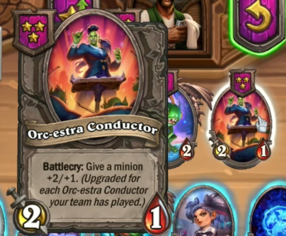 战吼:使一个随从获得+2/+1。(你的队伍每使用过一个Orc-estra Conductor后升级)