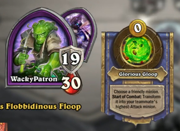 软泥教授弗洛普,选择一个友方随从,战斗开始时将其变形成为你队友的攻击力最高的随从。