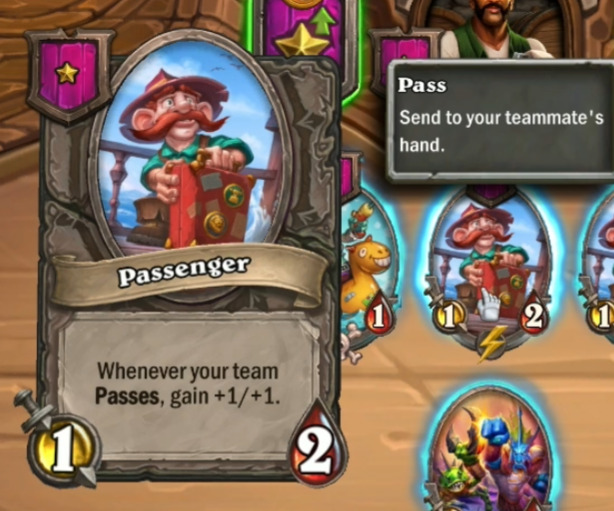 通过右下角的传送门,玩家可以将卡牌以新机制“传递(Pass)”的方式交给队友。普通传递的操作方式就是将卡牌拖动到传送门上(参考构筑模式的可交易机制,这也确实是战棋传递的设计来源)。