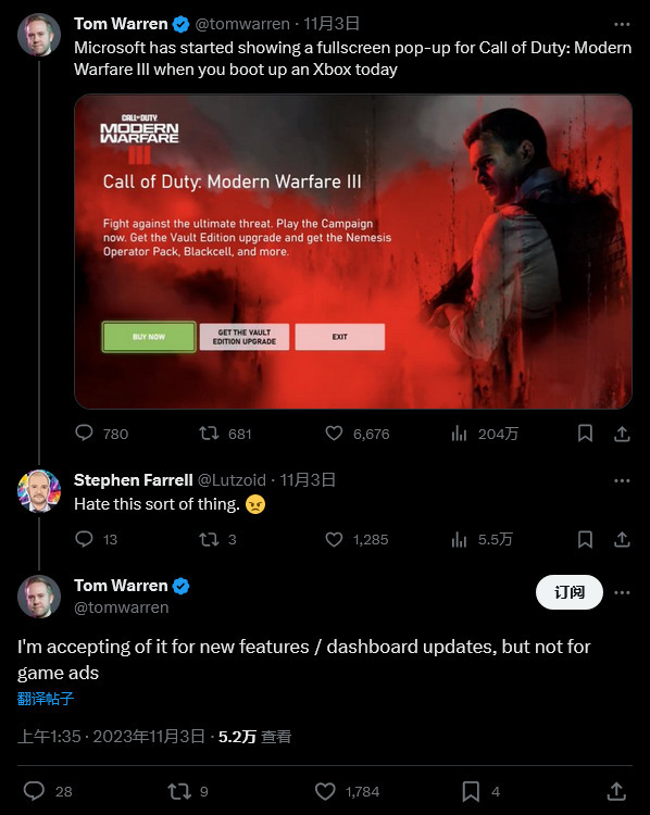 The Verge 编辑 Tom Warren 分享了他所看到的广告,并表示他虽然可以接受 Xbox 的“新功能/主页更新”,但是对此类广告等营销行为“不会同样宽容”。