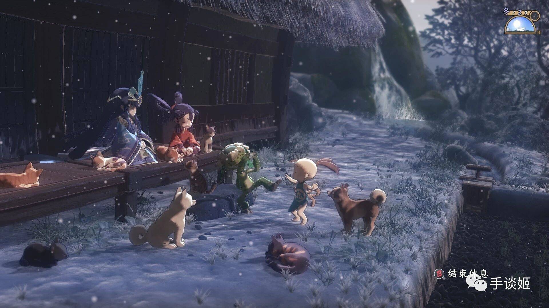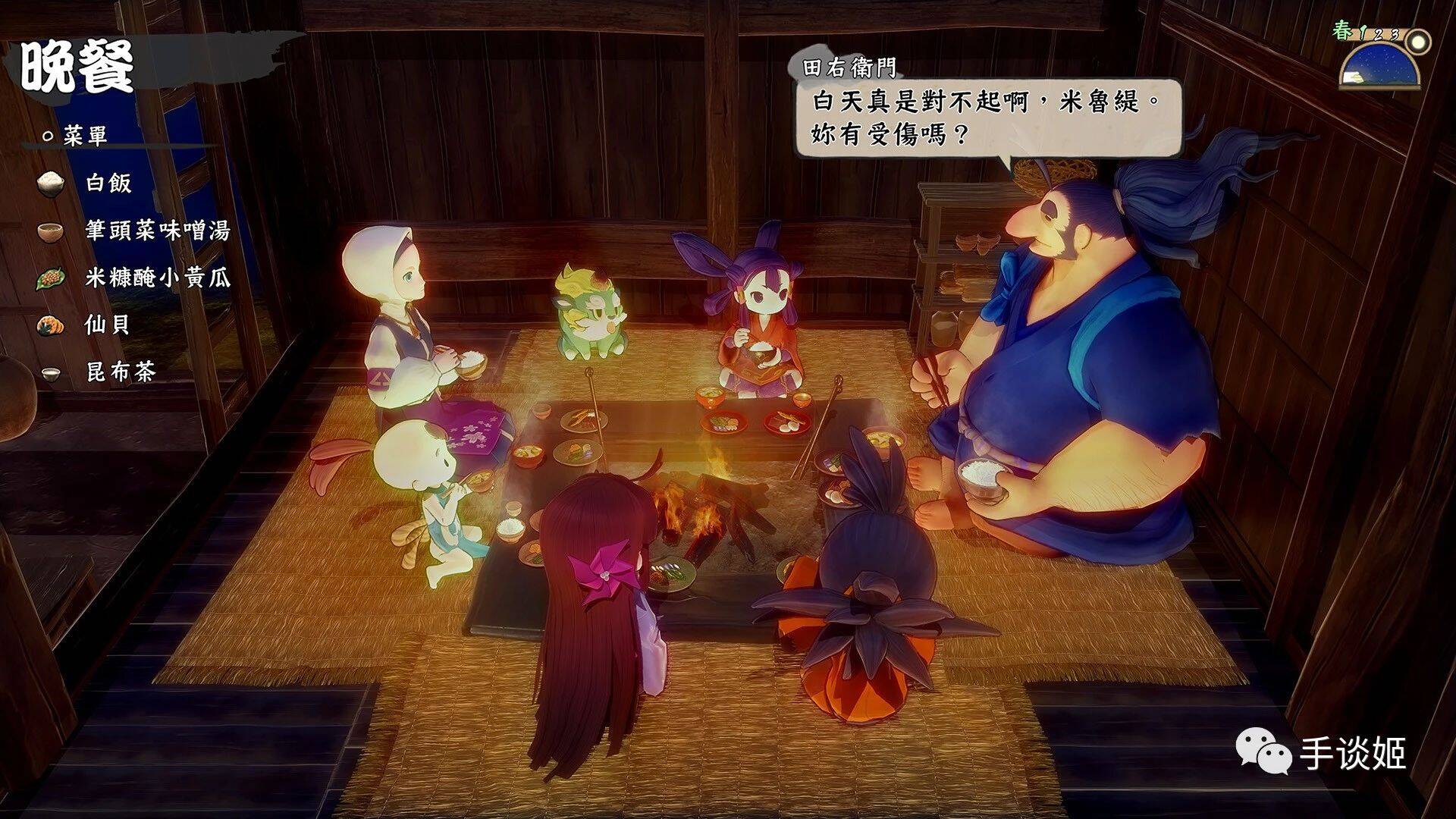 田间地头的昼夜变化和四季交替也给人带来一种别样的感觉,完全不同于现代都市生活后的那种下班的疲劳,因为游戏中主角一行人过的是经典的农耕生活,手谈姬在当初游玩时极少感受到那种现代社会无休止的生产力创造的需求,在游戏中可能今天为了有点好吃的多打一会儿,晚上回家看到有些人已经睡下了,把他们喊起来再吃一顿,众人一起吃饭的场景安心而又温馨,莫名产生一种愉悦感。