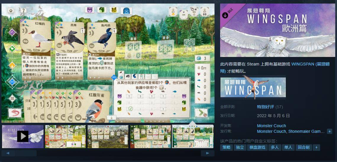 由Monster Couch开发,indienova发行,同名桌游改编的鸟类策略卡牌电子桌游《展翅翱翔(Wingspan)》宣布扩展DLC“大洋洲篇”将于12月12日发售,登陆Steam、Switch、Xbox One、微软商店、iOS和安卓,支持中文。在“大洋洲篇”中,将包含全新食物类型“花蜜”,以及来自大洋洲的近百种鸟类等丰富内容。