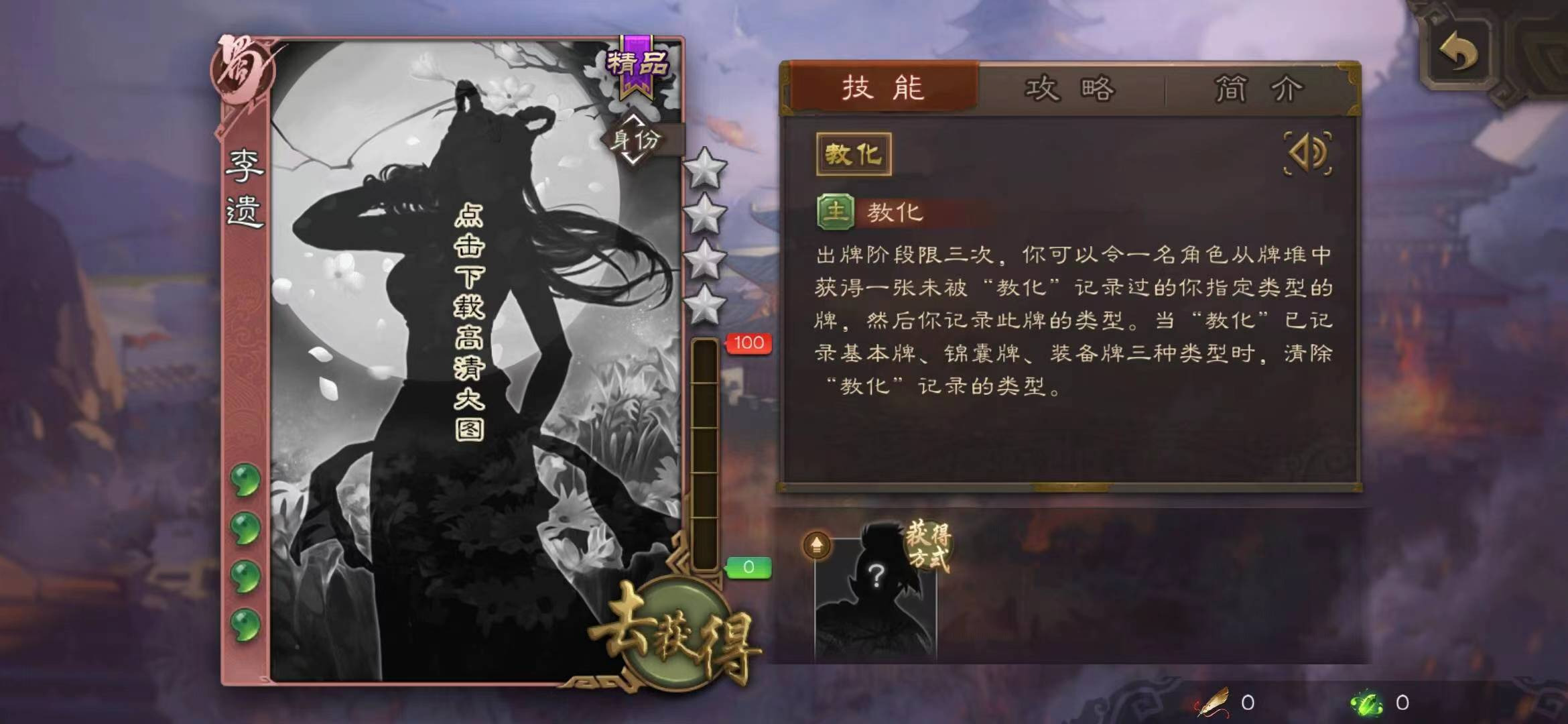 李遗的玩法也简单,想自己输出就对自己使用技能【教化】把牌摸满,之后根据手牌进行输出。如果队友输出能力更强,完全可以指定队友获得牌。李遗的优点很明显,那就是稳定,每个类型的牌都能获得,当然遇见不合适的牌也发挥不出实力。缺点是没有防御技能,如此强劲的辅助会有更高的嘲讽,好在李遗有是4血身板能抗一点。