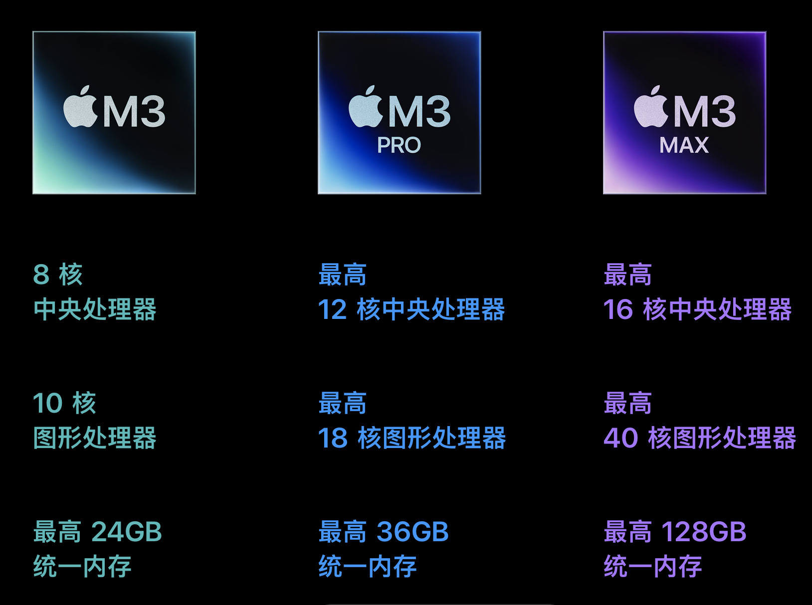 M3系列采用3纳米工艺,内置改进的神经引擎,可加速机器学习模型。配置M3、M3 Pro或M3 Max的MacBook Pro电池续航最长达22小时,深空黑色亮相,将于11月7日发售。