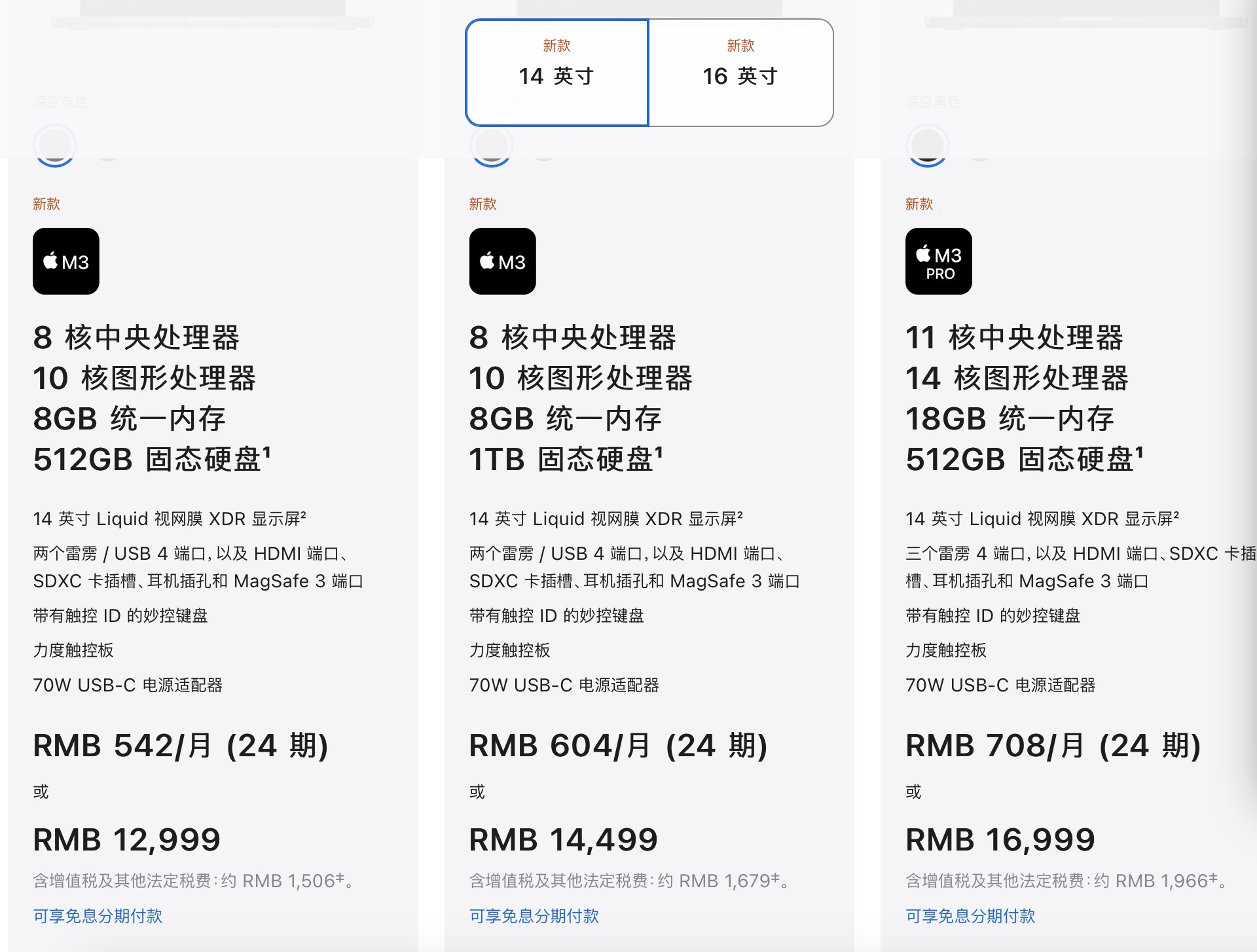 搭载M3芯片的14英寸MacBook Pro售价12999元(人民币,下同)或14499元,搭载M3 Pro的14英寸MacBook Pro售价16999元。