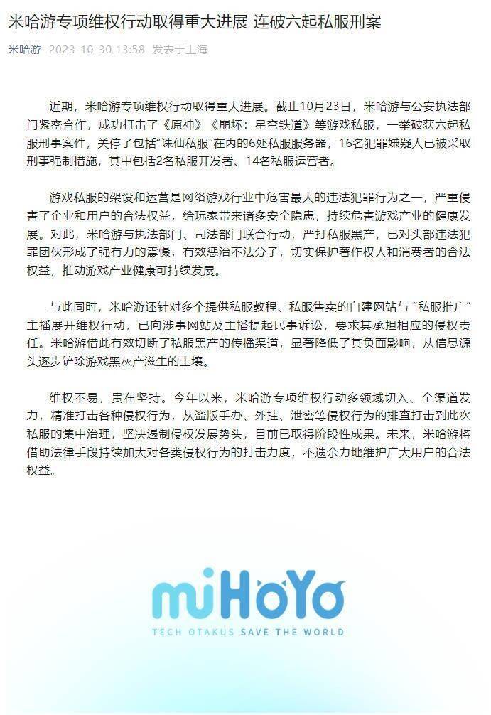 近日米哈游官方发布公告称,米哈游与公安执法部门紧密合作,成功打击了《原神》《崩坏:星穹铁道》等游戏私服,一举破获六起私服刑事案件。