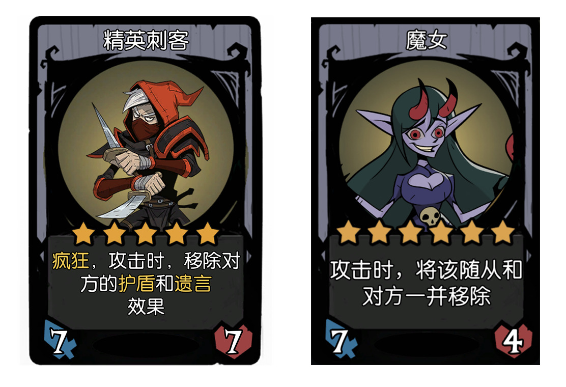 - 懊悔者,遗言:银色所有敌方获得-4-4,金色所有敌方获得-8-8,这张牌挺多时候都是配合幽龙祭司去触发的,可以达到让对面全是0/1的效果。