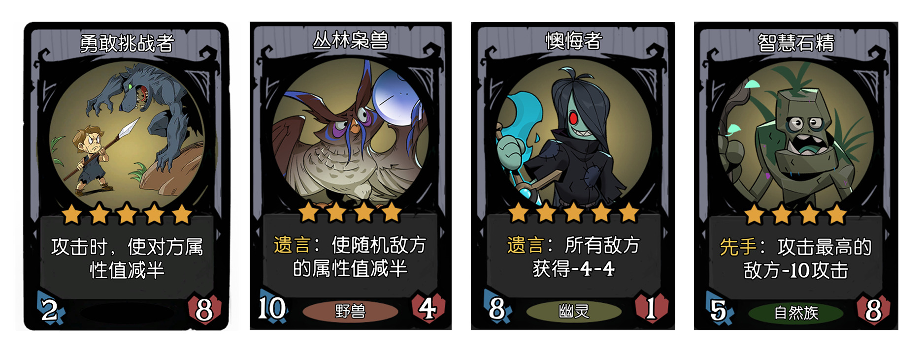 - 丛林枭兽,遗言:银色使随机敌方的属性值减半,触发1次,金色使随机敌方的属性值减半,触发2次。这张牌配合鼠王小丑,效果拔群!